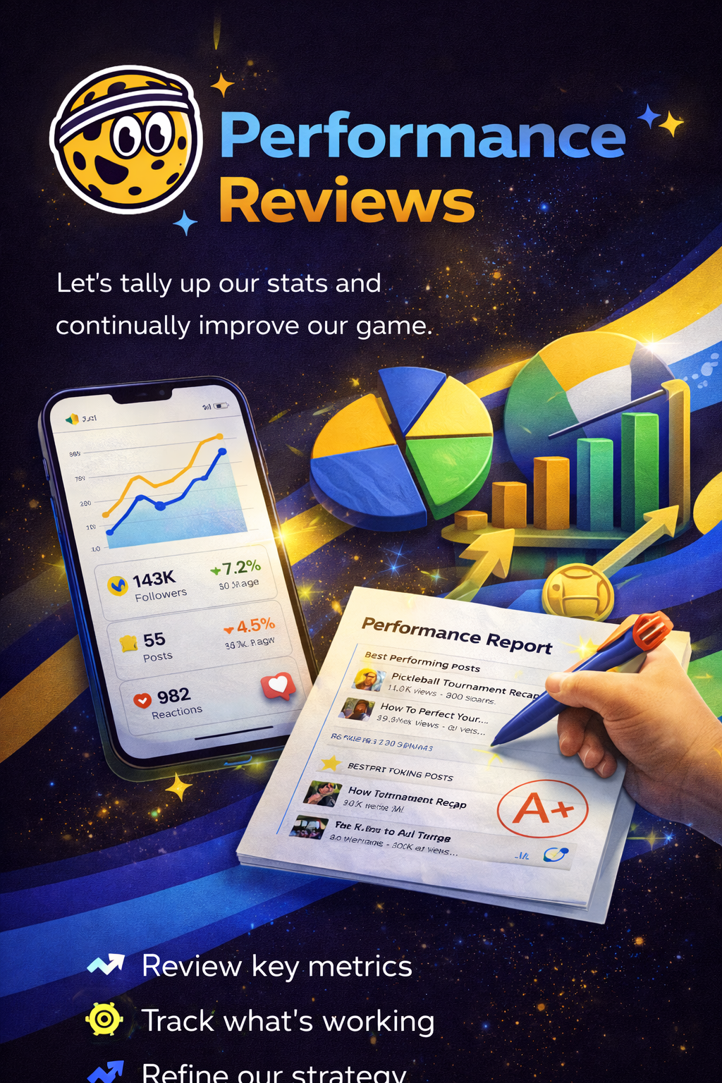 Let The Skorys Social team own the content calendar so your staff stays focused on running the club.